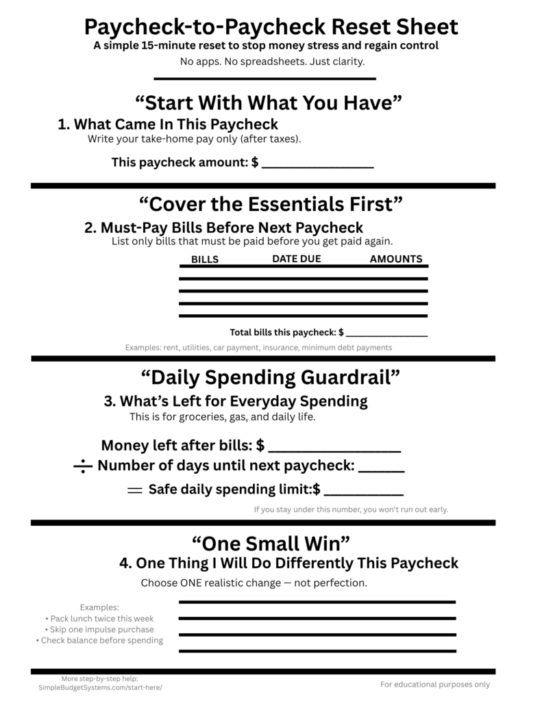 This reset sheet helps you focus only on the money you have right now, so you can stay in control between paydays.